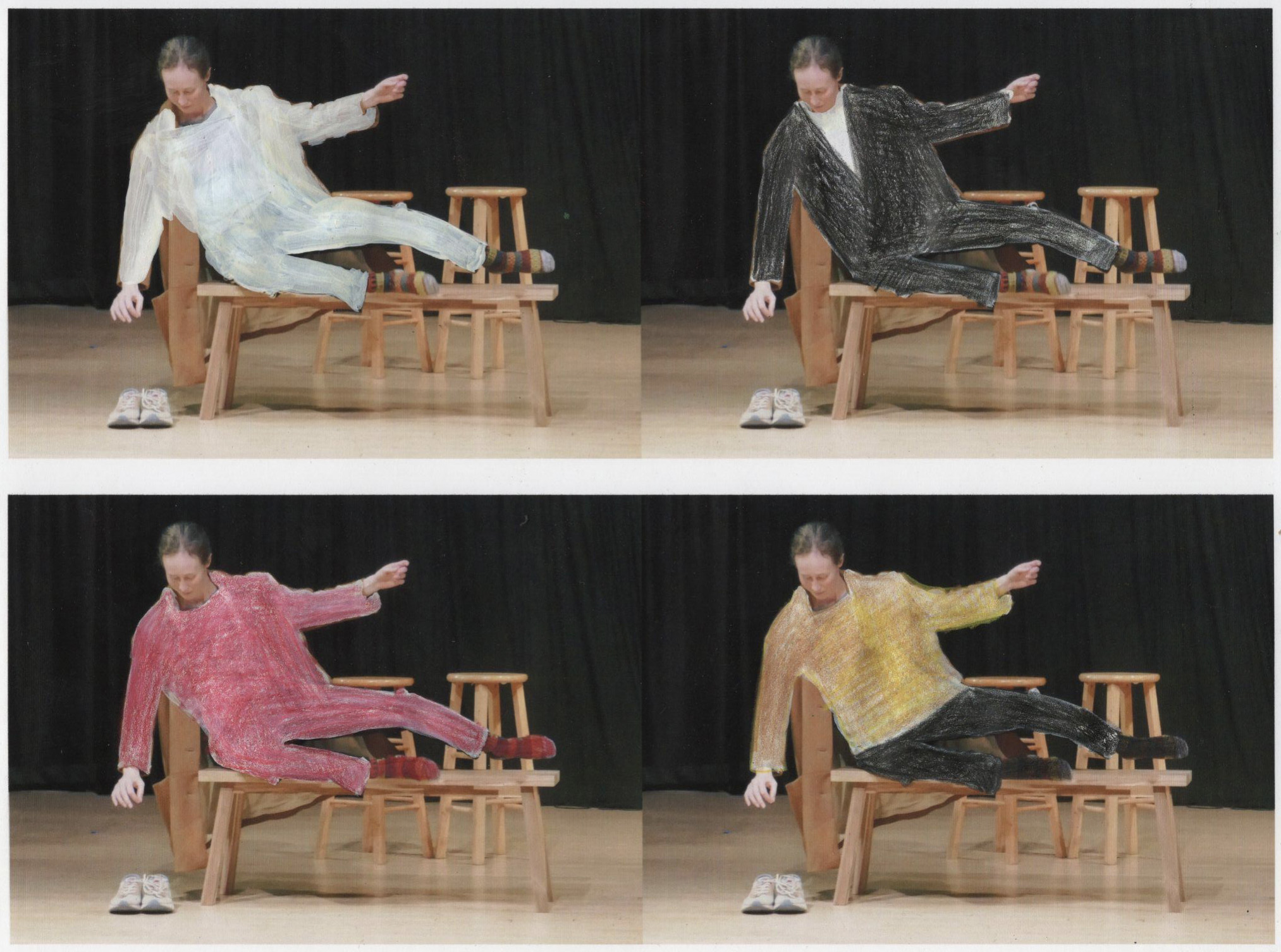 What does this statement from the director suggest? That they appear as versions of themselves with certain aspects amplified? As individual team members? What does the performance require? In the collaborative approach, we pose those questions to the artist overseeing wardrobe. Max delivered possibilities in the form of notes accompanied by rehearsal images duplicated and hand-colored for visualization.
